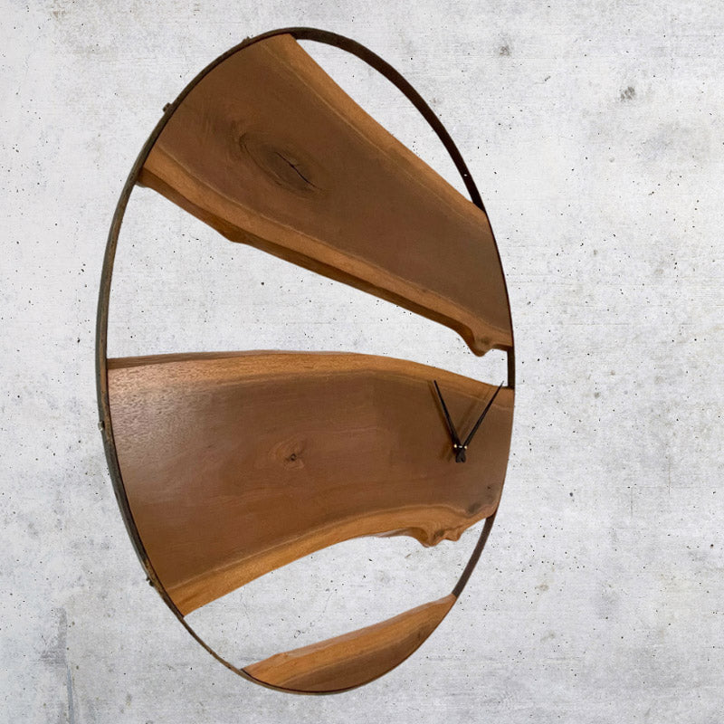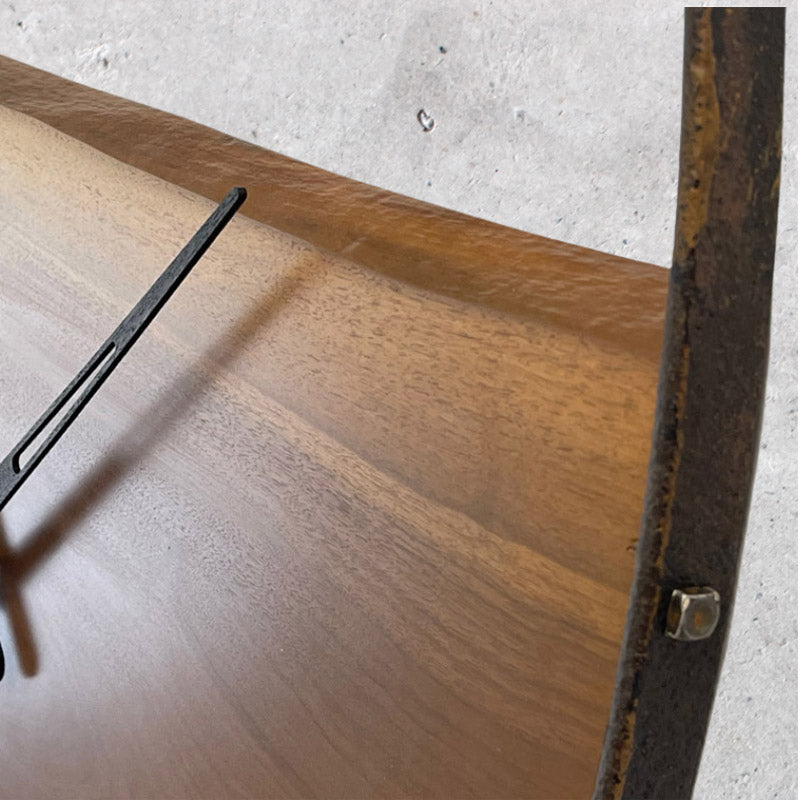 Each clock is one of a kind — no two pieces of walnut are ever alike. The iron frame retains its original patina, grounding the piece with a sense of history and strength.