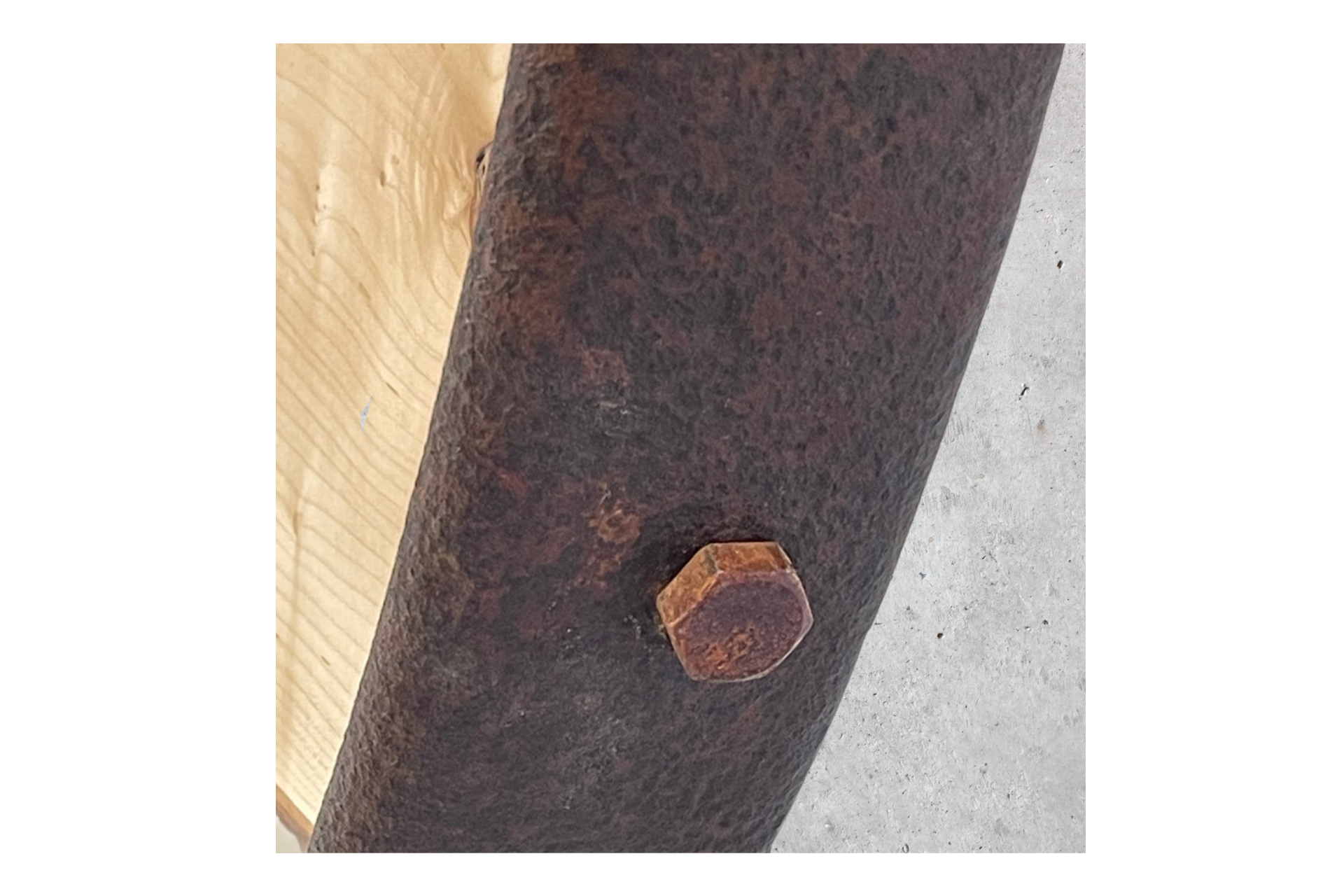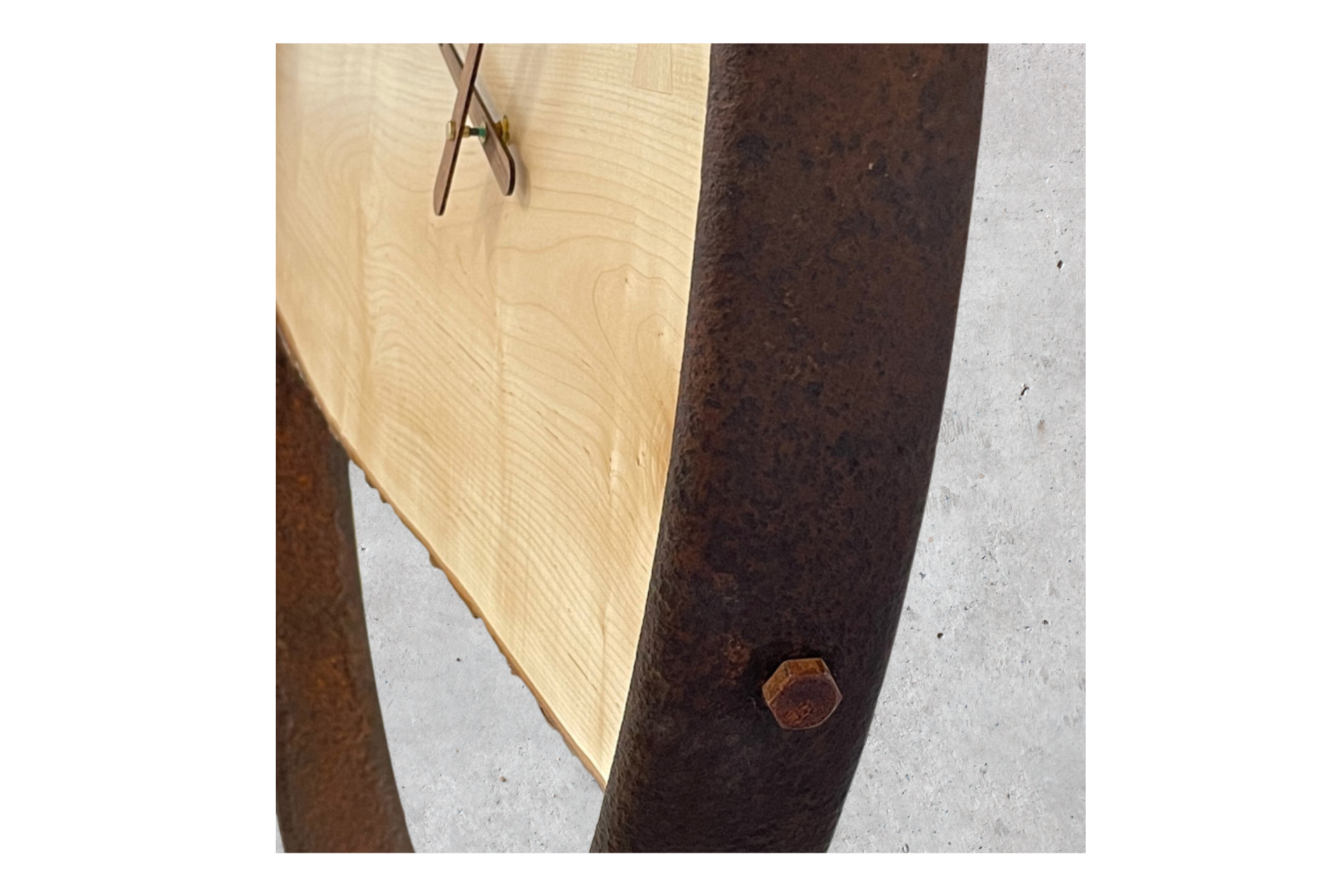 This striking 39-inch wall clock is handcrafted from solid maple and set into an authentic iron wagon wheel — complete with its original natural patina. The bold walnut hands add warmth and contrast, drawing the eye to the unique wood grain and iron frame.