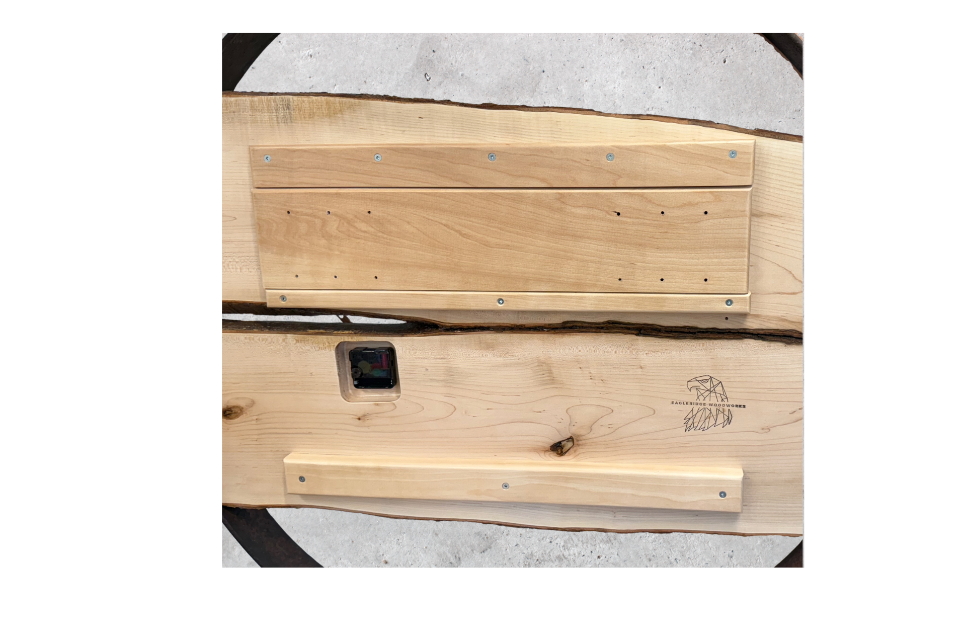 French cleat mounting system, pre-drilled at 16" on center with three potential mounting positions. The cleat provides a ½" standoff from the wall, protecting the surface and giving the clock a refined, floating appearance.